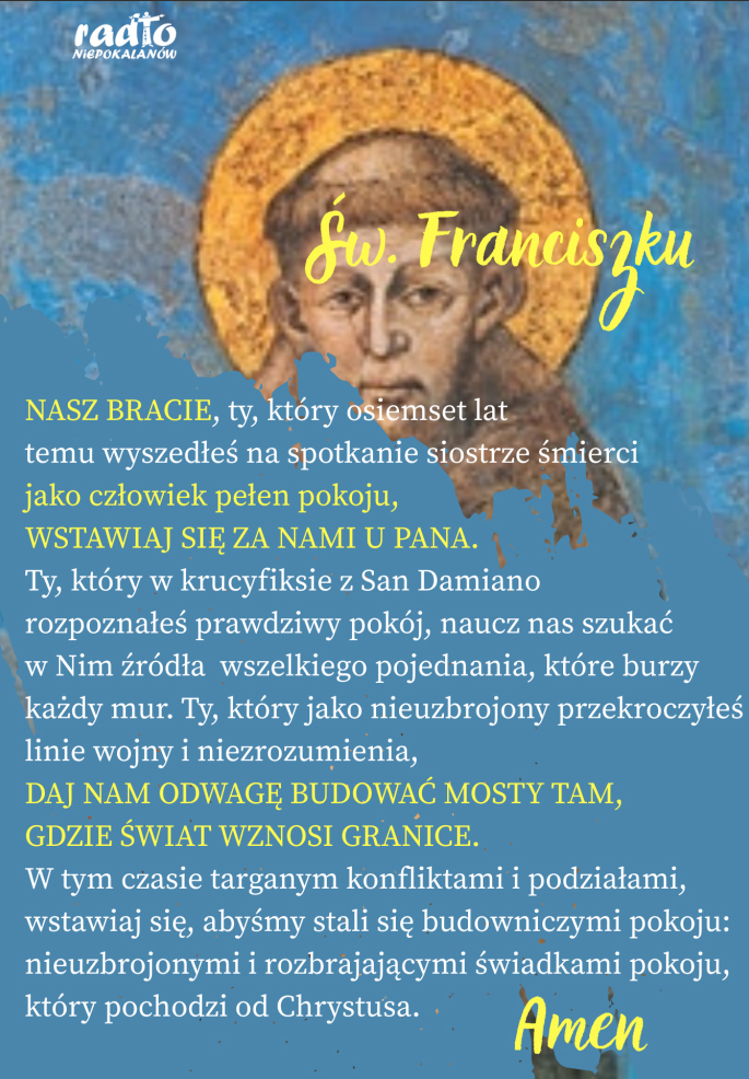 Zachęcamy do modlitwy w swoich intencjach za wstawiennictwem św. Franciszka z Asyżu. Poniżej modlitwa, którą zaleca papież Leon XIV: